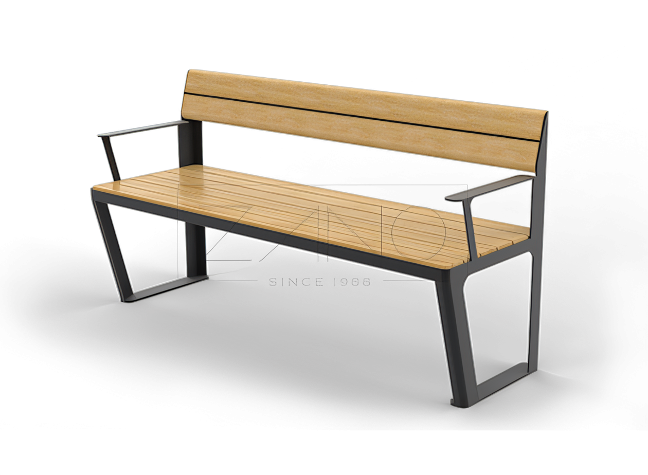 The Scandik 02.046.1 Bench epitomizes the sleek, functional aesthetics of Scandinavian urban furniture. It's all about minimalist design, clean lines, and meticulous attention to detail, making the bench both modern and visually appealing. This piece is superb for contemporary environments and is highly recommended for outdoor settings like parks, urban streets, and plazas. The Scandik 02.046.1 model includes both a backrest and armrests, offering additional comfort, particularly beneficial for elderly users. There are also models available only with a backrest or without any backrest at all. The bench's framework is crafted from steel, with options in stainless steel or carbon steel, which can be galvanized and powder-coated in any desired RAL color. The seating surface and backrest finishes come in wood, with alternatives in either HPL laminate or steel. Wooden options include local or exotic varieties. To ensure stability, the whole bench is anchored to the ground using dowels.