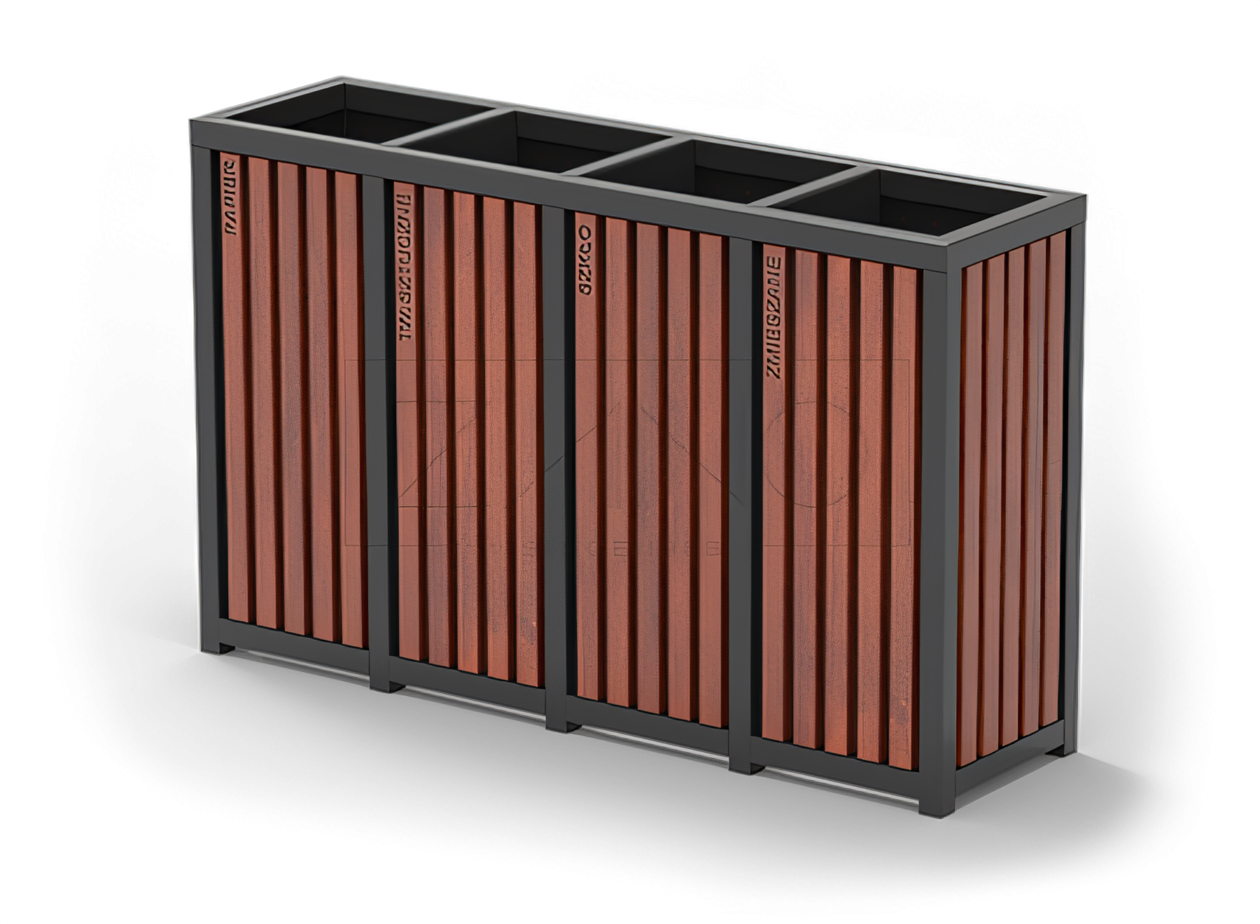 The Altus four-section recycling trash can is designed for sorted waste disposal. This eco-friendly receptacle pairs sleek steel with premium wood for a sophisticated look. Customers can select either structural steel coated in RAL color paint or stainless steel, complemented by either local or exotic wooden accents. The featured model includes four compartments, each equipped with a galvanized liner. For waste segregation, these compartments can be used with just the liner or with color-coded disposable bags. The Altus is highly functional, featuring engraved labels on each wood slat to indicate the compartment's use. Customization is available by altering these labels to meet customer specifications. The Altus recycling bin can function as a standalone unit in areas like shopping mall walkways or be securely fixed to the ground. With the Altus, you embrace both the modernity and elegance of urban furniture while contributing positively to environmental sustainability.